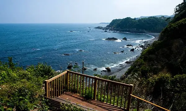 ゆるやかに始まる小道を進んで行くと、木々の向こうに海。さらに進むとベンチがあり、入り江から広がる海が見えます。