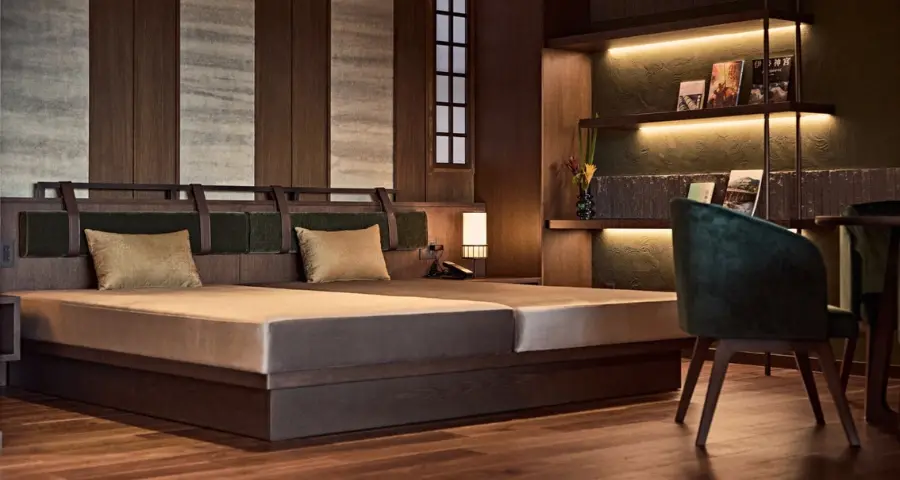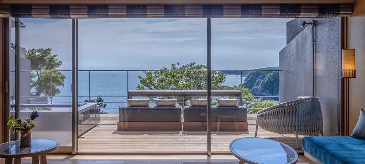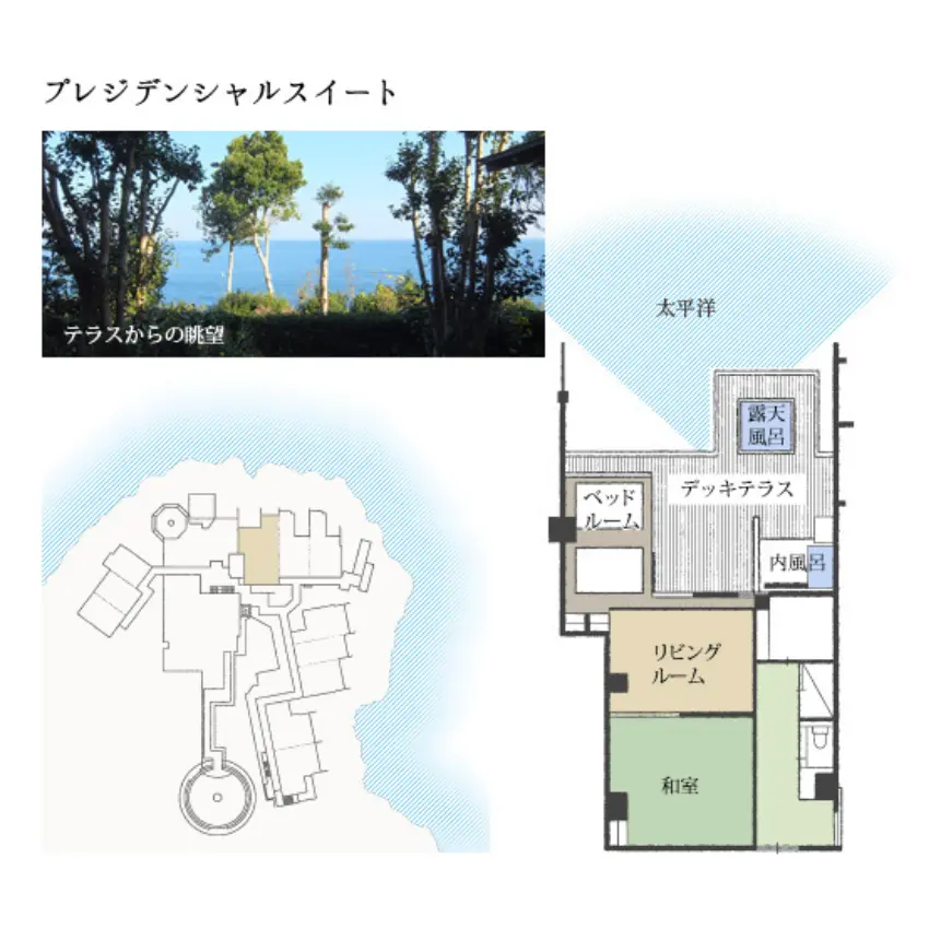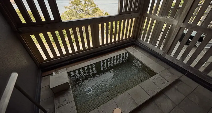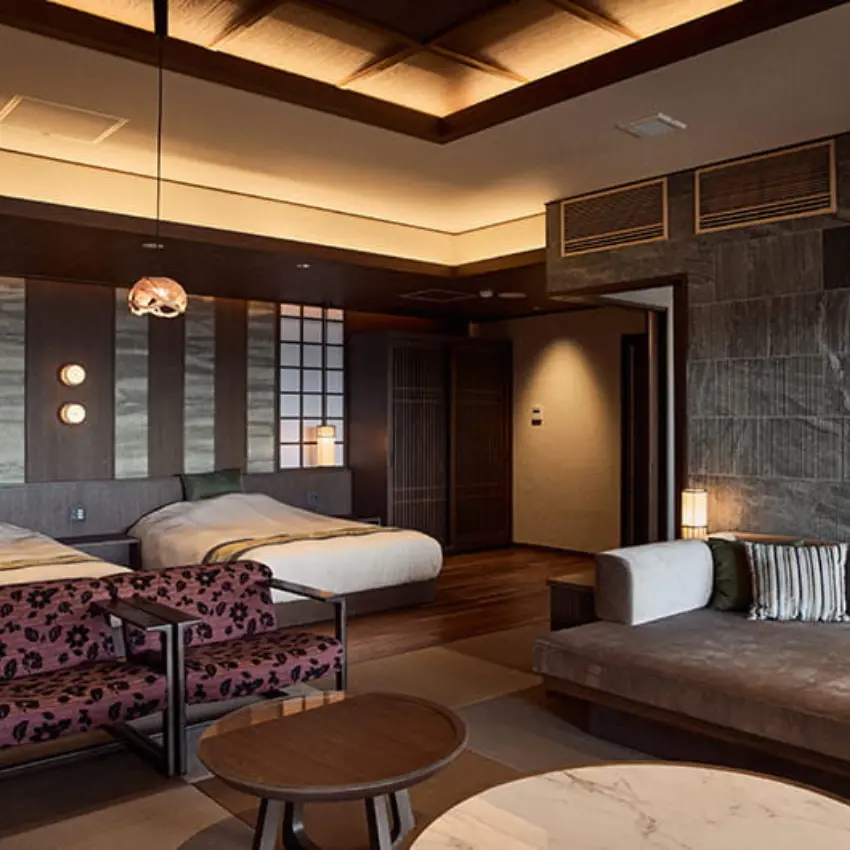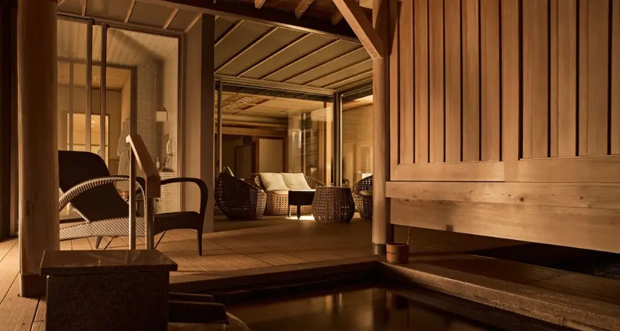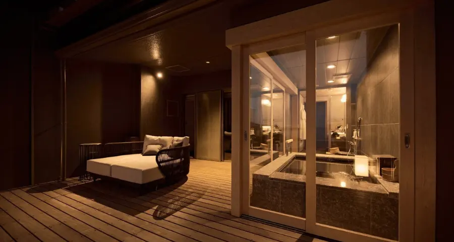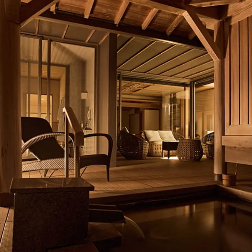 プライベートプールと専用サウナ、温泉露天風呂を備えた100平米の客室です。