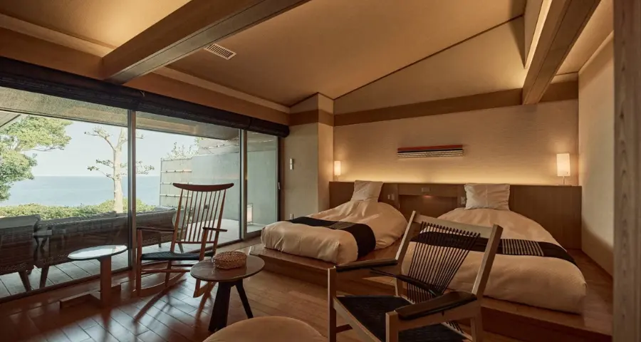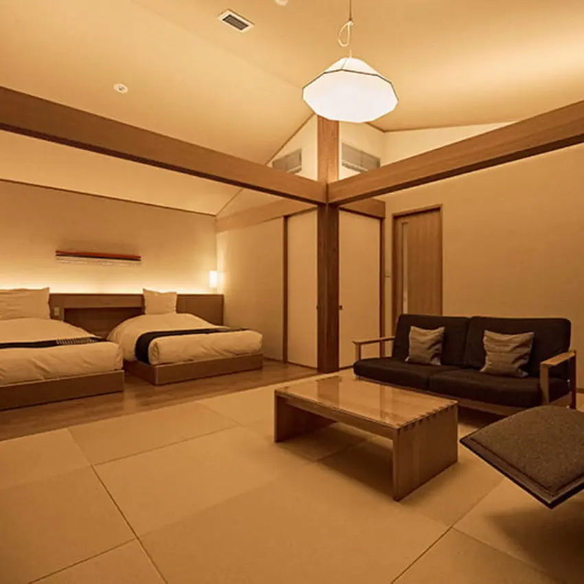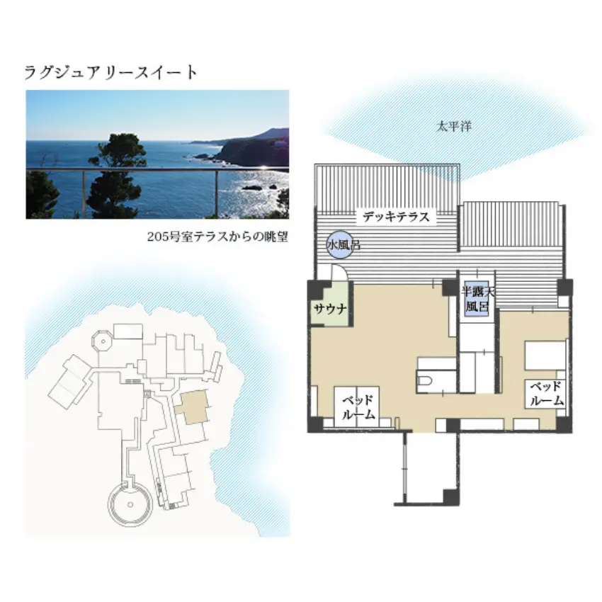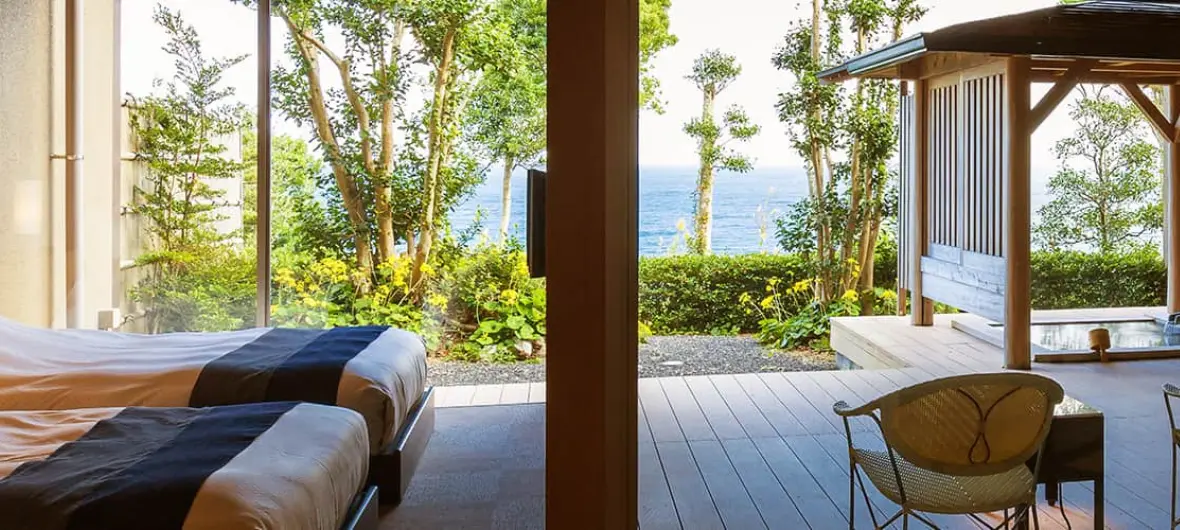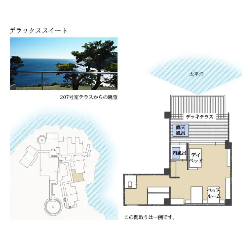 間取り:ツインベッド、デイベッド、温泉露天風呂、デッキテラス、ユニバーサルデザイン