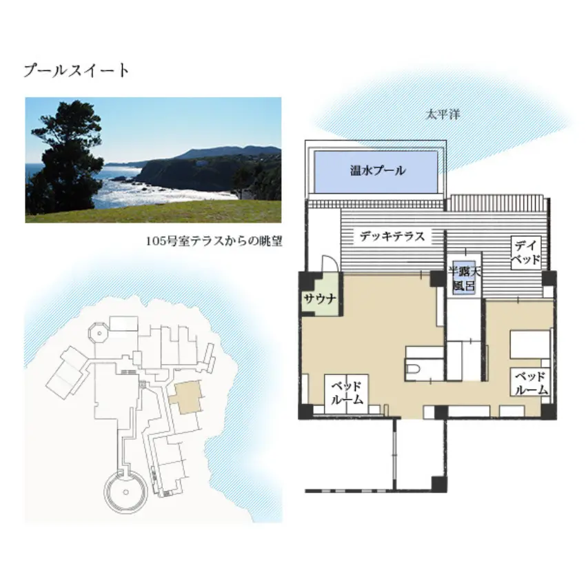 間取り:ツインベッド、ハリウッドツインベッド、専用プール、専用サウナ、温泉露天風呂、デッキテラス