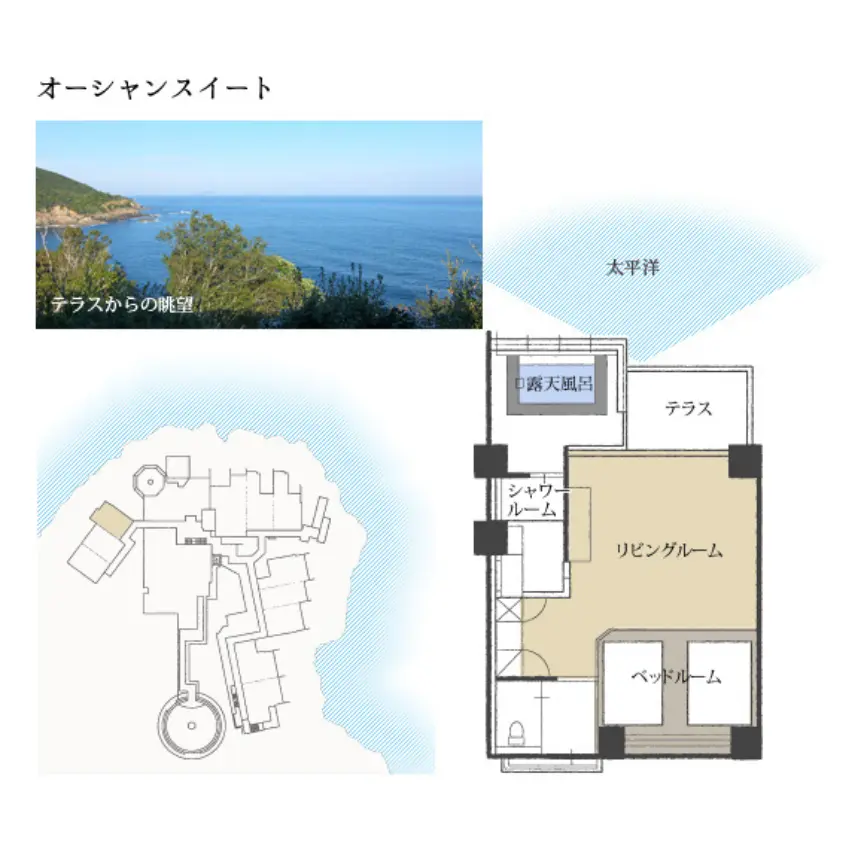 間取り:リビングルーム、ベッドルーム、温泉露天風呂、シャワールーム、テラス