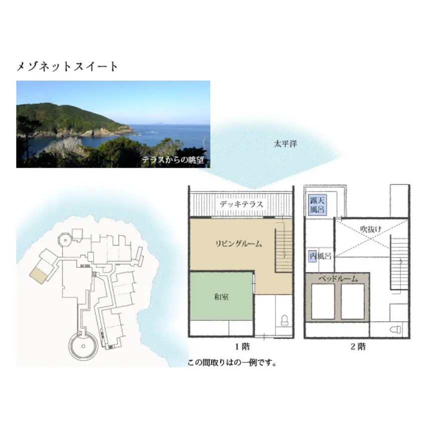 間取り:和室、リビングルーム、ベッドルーム、温泉露天風呂、内風呂、デッキテラス、専用デッキ