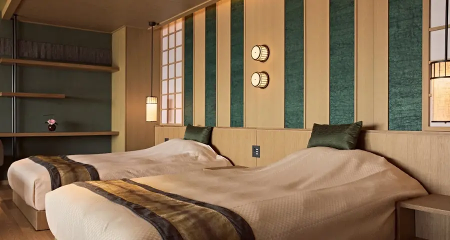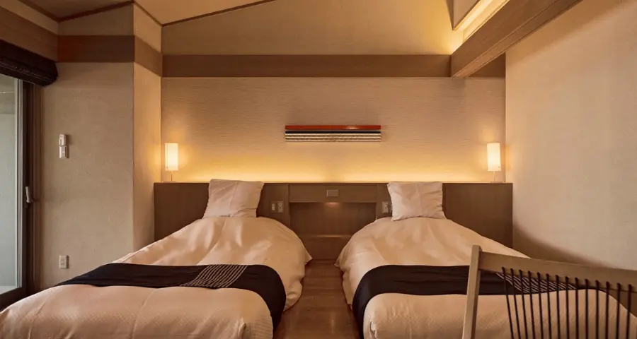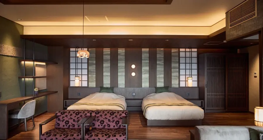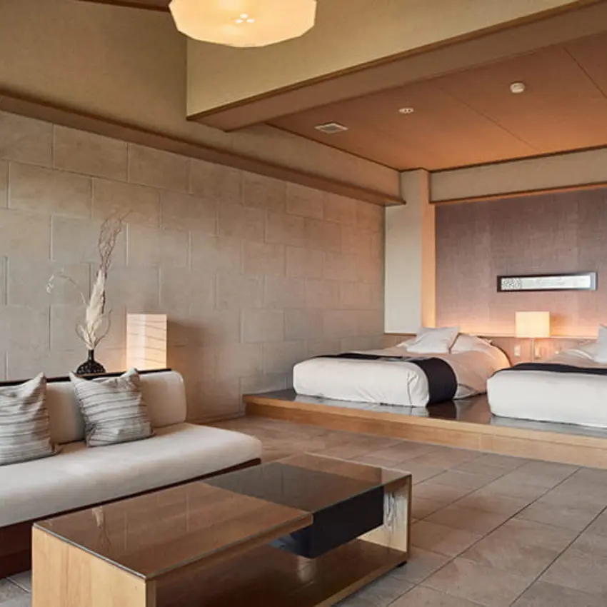ツインベッドとデイベッド、露天風呂を備えた客室70平米の洋室です。