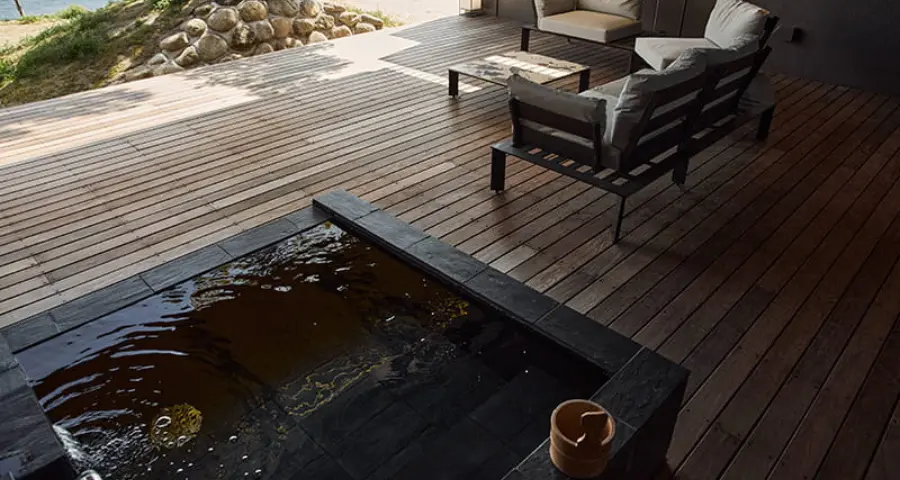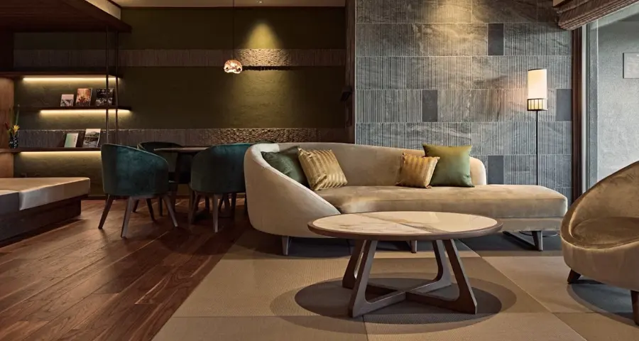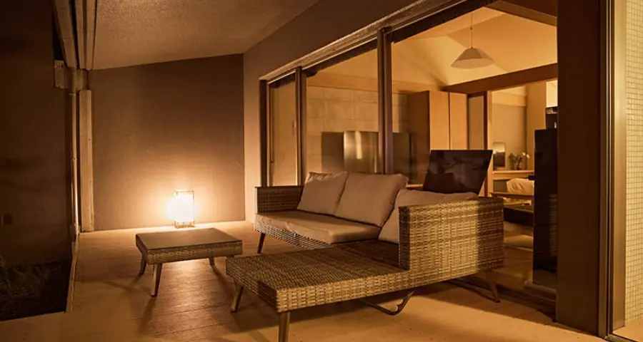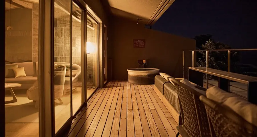 125平米の客室には、リビングルームとベッドルームのほか、12.5畳の和室を設け、さらにリラクゼーションチェアを備えた広いデッキは露天風呂へとつながっています。