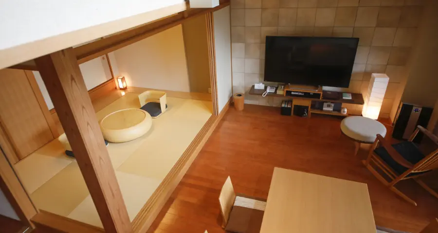 リビングルームとベッドルーム、露天風呂のほか、客室外に離れとしてリラクゼーションルームを備えた面積88平米の客室です。